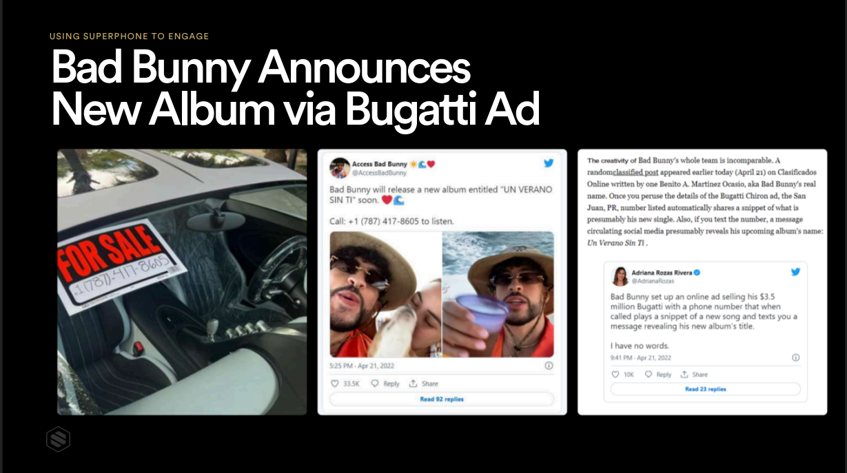 Learn how Bad Bunny used SuperPhone to launch his album "Un Verano Sin Ti" through a viral Bugatti “for sale” ad, turning one phone number into a global fan engagement campaign.